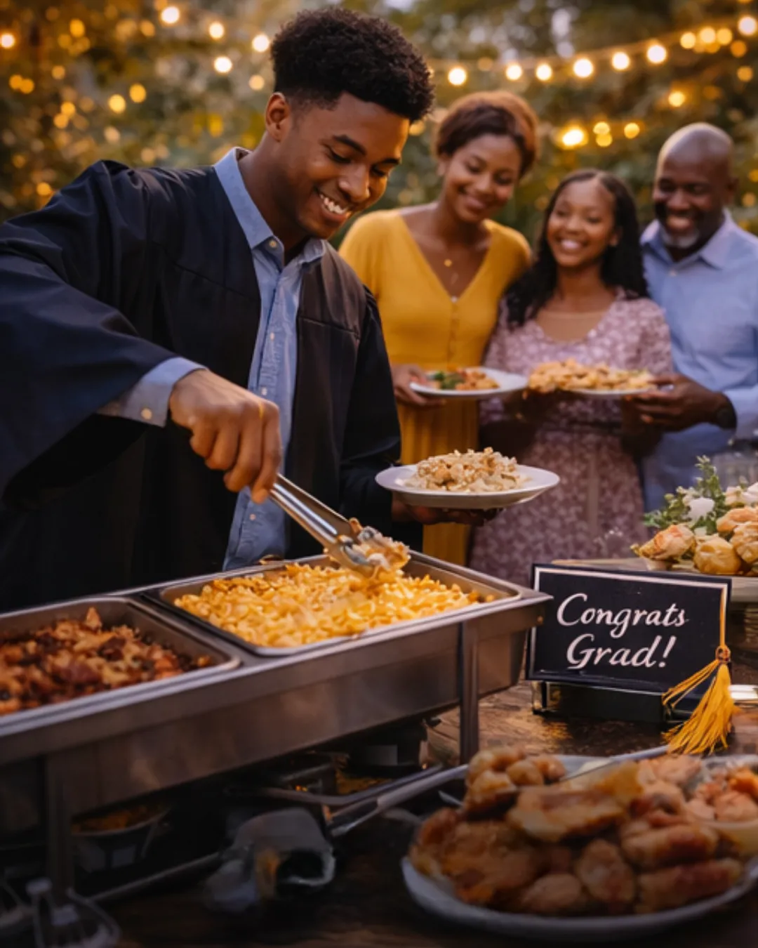 A crowd-pleasing graduation catering option featuring classic comfort favorites, thoughtfully presented for relaxed, come-and-go celebrations.