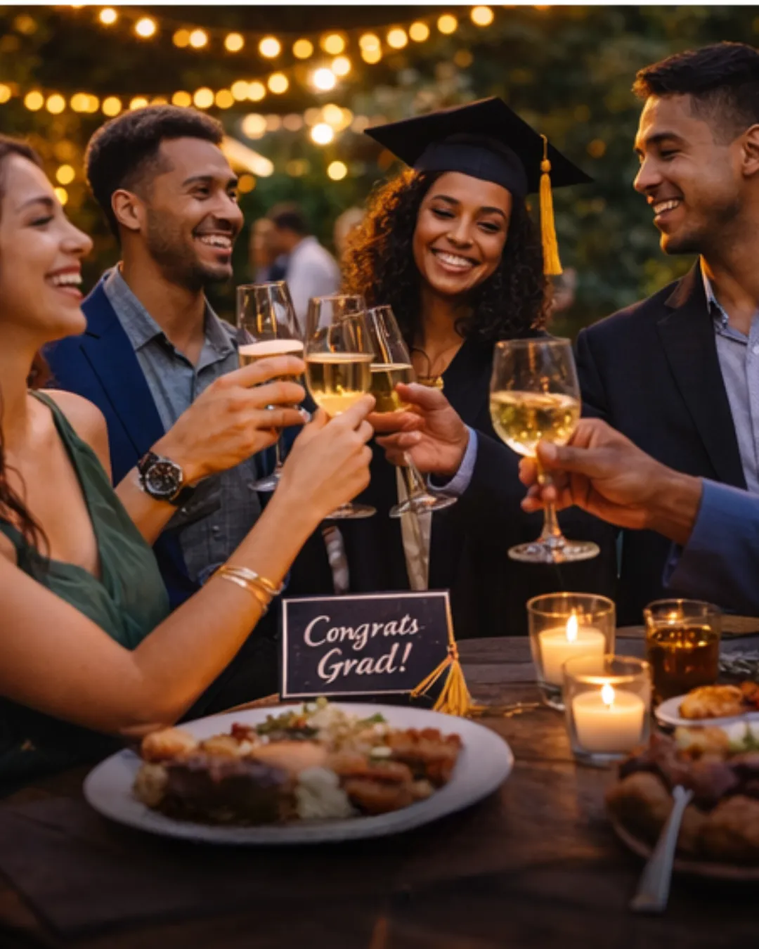A social, elevated graduation celebration featuring small bites and shared plates, ideal for mingling, toasting, and enjoying the moment together.